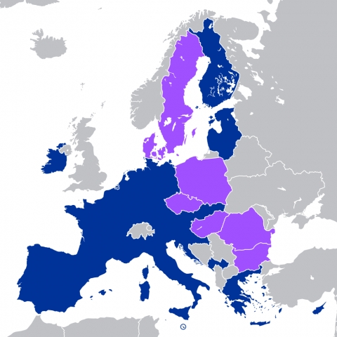 Ireland is part of the EU (dark blue & purple) and eurozone (dark blue).