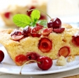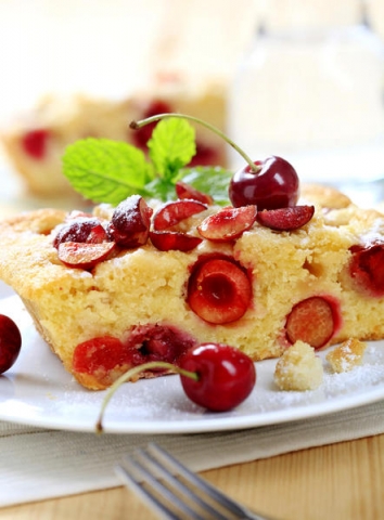 Testo vlijte v nama??čen pekač (premera 24 centimetrov) in potresite s če??njami, ki jih ne??no vtisnite v testo. Pecite pribli??no 50 minut. Mlačen kolač potresite s sladkorjem v prahu.