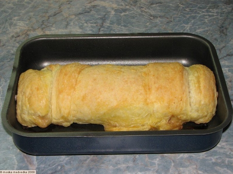 Meso svinjske ribice narežemo na medaljone, jih posolimo in popopramo ter položimo na listnato testo.