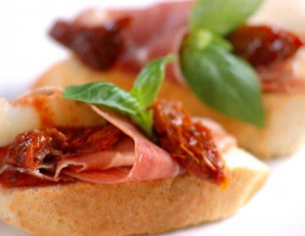 SESTAVINE: 4 srednje velike rezine belega ali črnega kruha, 4 v olju vlo??eni suhi paradi??niki, 4 rezine kra??kega pr??uta, parmezan, olivno olje, 4 stroki česna, 8 lističev bazilike.