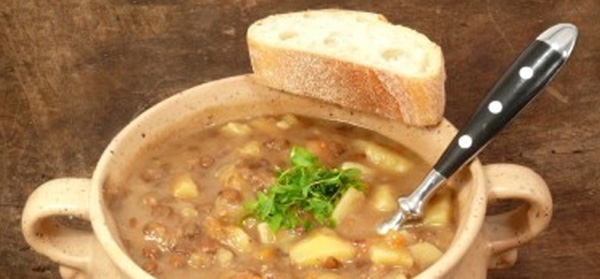 Sestavine: 1 čebula, 1 por, 35 dag korenja, 20 dag zelene leče, 10 dag rdeče leče, 1 ??lička karija, 1,5 litra zelenjavne ju??ne osnove, 4 hrenovke, sol, poper.