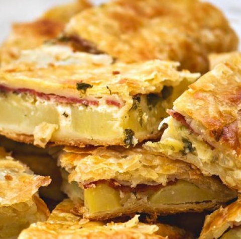Sestavine: 80 dag krompirja, 8 dag masla, 10 dag na rezine narezane ??unke, 6 dag naribanega sira, sol, poper.