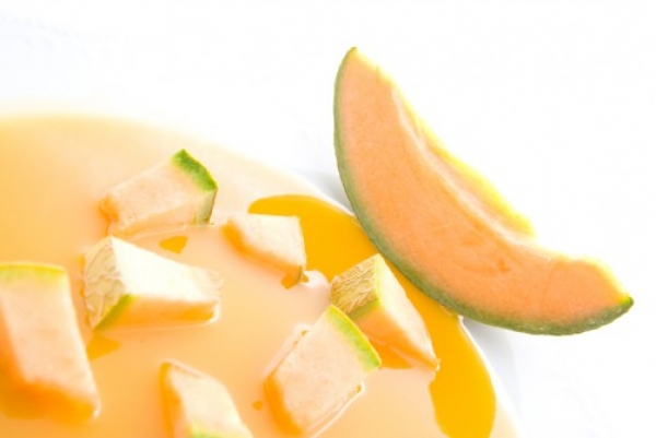 Sestavine: 1 kg zrele melone, 1 dl belega vina, sladkor v prahu, limona, nekaj vejic sve??e mete.