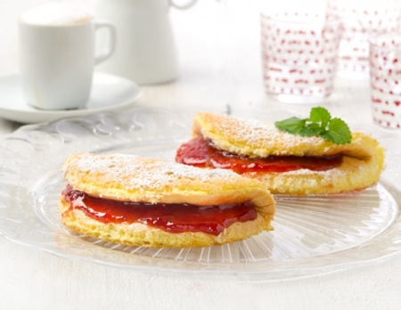 Omleto bogato namažite z brusnično marmelado in smetano, seveda pa lahko uporabite tudi marmelado, ki ste jo pripravili sami.