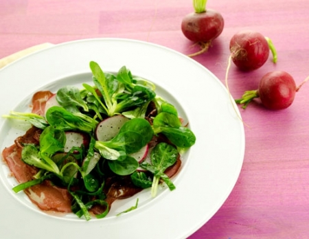 Za pripravo jagnječjega karpača s solato iz redkvic, pehtrana in motovilca iz jagnječjega hrbta odstranimo mačobo in srebrnkasto povrhnico. Na drobno nasekljamo zeli??ča in jih vtremo v meso, nato ga ovijemo v folijo za kuhanje in alufolijo ter ga za dve uri postavimo v zamrzovalnik. Z rezalnim strojem ali no??em meso nare??emo tanke rezine in ga narahlo potolčemo.