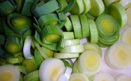Por očistimo, operemo in nare??emo na kole??čke, ki jih dve minuti blan??iramo v kropu. Por odcedimo.
