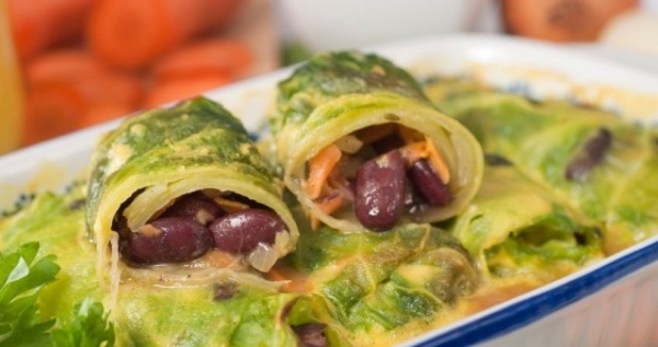 Fi??ol odcedimo. V skledi dobro zme??amo preostanek pra??ene čebule in česna, fi??ol, sir, korenje in začimbe. Pečico vključimo na 175 °C. Namastimo globok keramični ali stekleni pekač. Zeljne liste razporedimo po delovni povr??ini in jih na debelej??em delu oblo??imo z nadevom, nato pa jih zvijemo v zavitke, podobno kot sarme. Oba konca vsakega zvitka zavihamo in s prstom porinemo navznoter, da nadev med peko ne bo uhajal. Zvitke zlo??imo v pekač s prekritim robom navzdol in jih prelijemo z omako. Pečemo v ogreti pečici vsaj 20 minut.