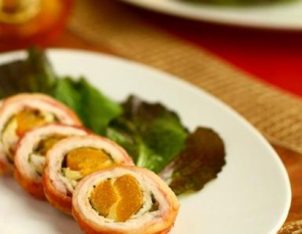 Vse skupaj zavijemo v rulado in konce testa dobro stisnemo skupaj. Obe ruladi polo??imo na pekač, oblo??en s papirjem za peko. Pečemo v pečici, ogreti na 200 stopinj, pribli??no 25 minut. Pečeno rulado nare??emo na rezine.