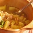 Na olju popra??imo nasekljano čebulo, dodamo krompir, korenje in ju??no osnovo.