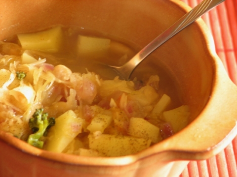 Sestavine: 60 dag kislega zelja, 50 dag drobnega krompirja, 30 dag korenja, 3 ??lice olja, 2 litra ju??ne osnove, 3 ??lice paradi??nikove mezge, 2 čebuli, 2 ??lički mlete sladke paprike, 1 dl kisle smetane.