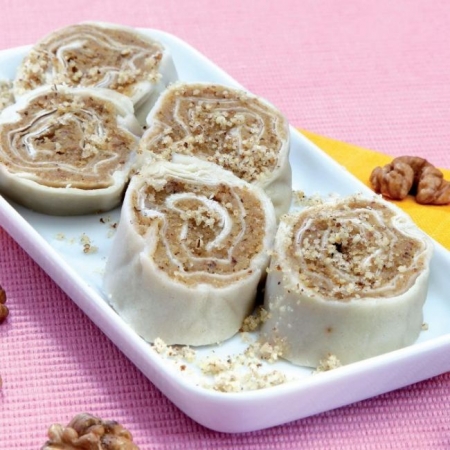 SESTAVINE: 500 g moke, 2 ??lici sladkorja, 2 jajci, 2 ??lici olja, mleko, 20 g kvasa, ??čepec morske soli. Za orehov nadev ??e 300 g mletih orehov, 1 pest rozin, 150 g sladkorja, 2,5 dl sladke smetane, 1 ??lico drobtin, cimet v prahu, mlete klinčke, lupino ekolo??ko pridelane limone, ??ilce ruma. Za zabelo ??e 50 g masla, 2 ??lici drobtin.