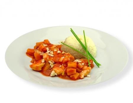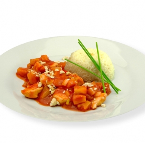 V loncu prepražimo čebulo, česen in čili, zalijemo s kisom in pustimo kuhati, da se nekoliko zgosti. Zalijemo s paradižnikovo omako in medom. Dodamo koščke ananasa (brez soka) in rahlo kuhamo nadaljnjih 10 minut. Nato piščanca narežemo na koščke, začinimo s soljo in poprom in ločeno prepražimo. Pečeno piščančje meso nato vmešamo v sladko-kislo omako.