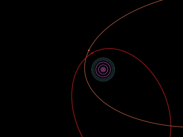 V774104 naj bi spadal v isto družino planetoidov kot Sedna in 2012 VP113. Ta skupina se ponaša z ogromnimi orbitami. Na posnetku sta prikazani z rumeno in rdečo črto, medtem ko so vsi drugi znani planeti Osončja stlačeni v vijoličastem območju. Z zeleno je označen Kuiperjev pas. Foto: Scott S. Sheppard/Carnegie Institution for Science