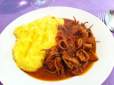 ?ebulo prepra??imo na olivnem olju, dodamo česen in vse morske sade??e, razen ribjega fileja. Nekoliko prepra??imo, zalijemo z malvazijo in kuhamo nekaj minut. Nato dodamo paradi??nikovo omako in ribjo osnovo, solimo in popramo. Po ??elji lahko dodamo ??e čili. Du??imo, dokler se sipe ne zmehčajo. Dodamo ??e polento in kuhamo toliko časa, da je polenta pripravljena.