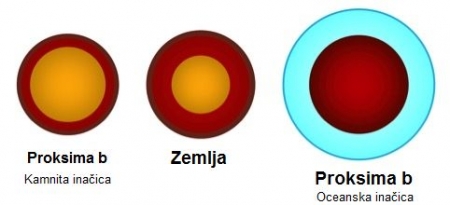Po drugem scenariju polmer zna??a 1,4 Zemljinega oziroma 8.920 kilometrov. Pol kamnitega jedra, pol pa vode. V tem primeru bi celotno povr??ino Proksime Kentavre b prekrival tekoč ocean z globino 200 kilometrov. Na tej globini bi tlak ??e tako narastel, da bi se voda spremenila v led pod visokim pritiskom, ta pa bi jedro planeta dosegel pri 3.100 kilometrih globine. V obeh primerih bi planet obkro??ala tudi tanka atmosfera, sporoča CNRS.
