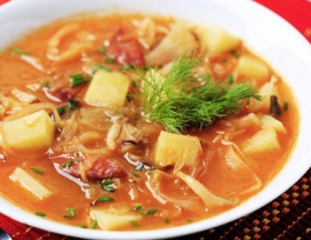 SESTAVINE: 600 g kislega zelja, 500 g krompirja, prekajeno klobaso, sesekljano čebulo, 2 ??lici paradi??nikove mezge, ??ličko mlete paprike, ??lico moke, 1 dl kisle smetane, lovorov list, sol in poper.