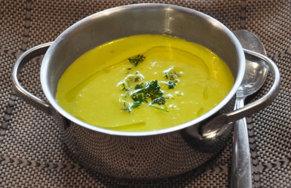 2 zeleni kolerabici, 2 pora, 30 dag ohrovta, 30 dag brokolija, 1 liter zelenjavne jušne osnove, maslo, kisla smetana, sol, poper.