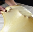 4. Dovolj veliko mizo ali pult prekrijemo s prtom in ga dobro pomokamo. Testo zvrnemo na prt, narahlo pomokamo in tanko razvaljamo ali med rokami raztegnemo.