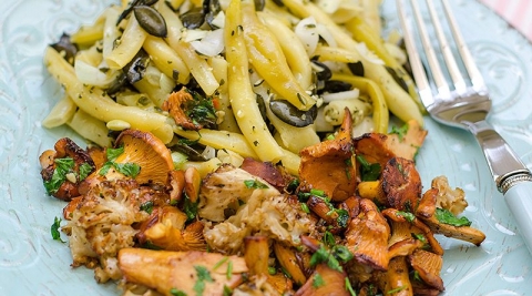 stročji fižol bučna semena mlada čebula olivno olje jabolčni kis popečene gobice (lisičke, borova gliva, golobica)
