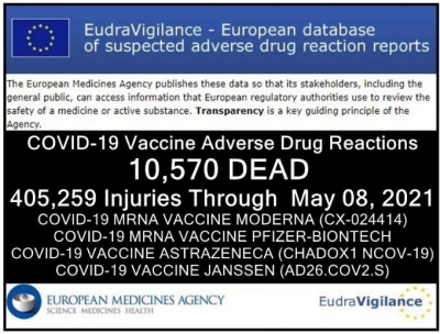 Evropska baza stranskih učinkov po Covid-19 genski terapiji do 8.5.2021: 10.570 mrtvih in 405.259 poškodb (17.05.2021) | newsexchange ... Evropska podatkovna baza stranskih učinkov zdravil, med drugim tudi stranskih učinkov zaradi eksperimentalnih injekcij mRNA genske terapije, se imenuje Podobno