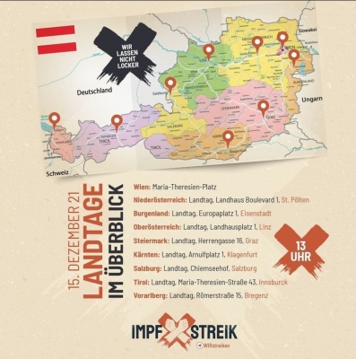 AVSTRIJA: 15.12.2021 PROTEST PRED VSAKIM DEŽELNIM ZBOROM (13.12.2021) | newsexchange ... V Avstriji bo prišlo do velikih protestov, ki se bodo zgodili pred vsemi deželnimi zbori./div Podobno