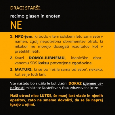 Dragi starši, skrbniki, dedki in babice! Pod pretvezo »lažjega« ponovnega odpiranja šol je Ministrstvo za zdravje pričelo s pripravami za testiranje otrok. DOVOLJ JE BILO!!! (01.04.2021) | newsexchange ... Dragi starši, skrbniki, dedki in babice! Pod pretvezo »lažjega« ponovnega odpiranja šol je Ministrstvo za zdravje pričelo s pripravami za testiranje otrok. DOVOLJ JE BILO!!!NE DOVOLIMO ... | Podobno