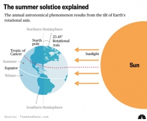 Na poletni solsticij je največji osni nagib Zemlje proti Soncu 23,44°. Prav tako je Sončev odklon od nebesnega ekvatorja 23,44°.