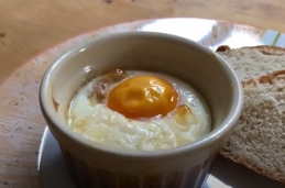 Jajce na oko v ramekinu, s šunko, sirom in zelišči