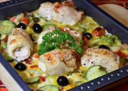 Piščančje roladice so jed, ki združuje preprostost piščančjega mesa z bogastvom okusov in privlačnim videzom. Nežni piščančji zavitki, polnjeni s sirom ali zelenjavo, so pečeni v kremni omaki skupaj z barvito zelenjavo, kot so bučke, češnjev paradižnik, olive in brokoli. Ta jed je kot nalašč za tiste trenutke, ko želite pripraviti nekaj posebnega, a hkrati ne preveč zapletenega. Kremna omaka, obogatena z jajci in začimbami, poskrbi, da so roladice sočne, medtem ko zelen doda svežino in teksturo.
