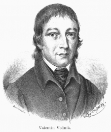 Valentin Vodnik [valentín vódnik], slovenski duhovnik, frančiškan, pesnik, prevajalec, razsvetljenec, jezikoslovec, učitelj, novinar in urednik. Wikipedija