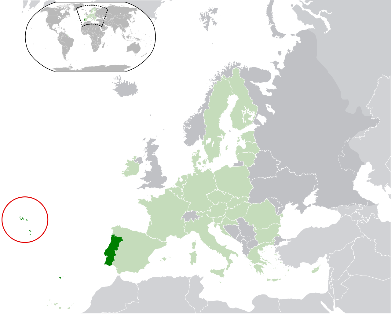 Lega Azorov znotraj Portugalske (temno zelena) in Evropske unije (svetlo zelena)