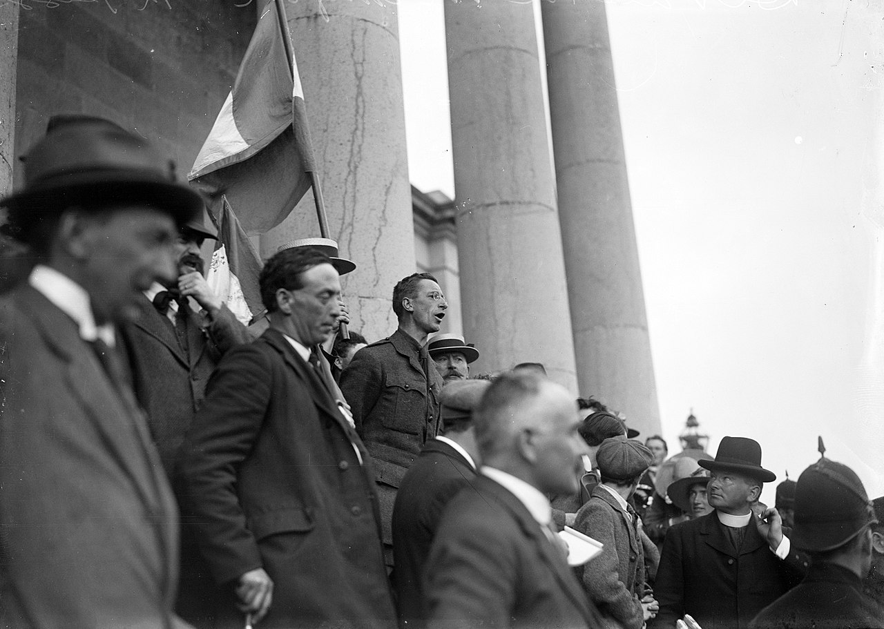 Éamon de Valera, irski politični voditelj, na sliki pred sodiščem v Ennisu leta