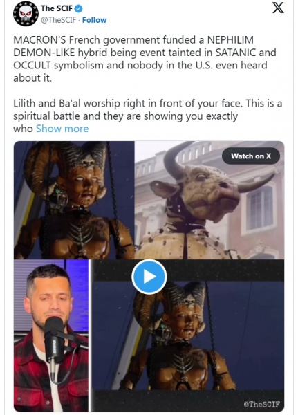 Prošlog vikenda, vlada Emmanuela Macrona financirala je „paradu“ financiranu od poreznih obveznika nazvanu Vrata tame, na kojoj su se nalazila 4,5 metra visoka demonska hibridna stvorenja, rogati idol Lilith na plutajućem oltaru, omaž Minotauru/Ba’alu s dječjim žrtvovanjem, naopako okrenutim križevima, pentagramima i očitom simbolikom trostruke šestice – sve pred više od milijun ljudi, uključujući djecu.