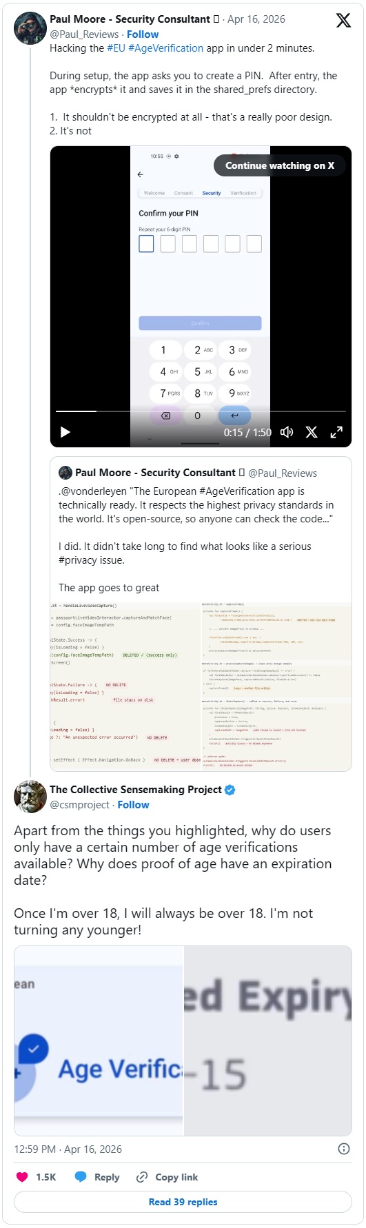 Moore je pokazao koliko je nevjerojatno nespretno aplikacija programirana. Zaštita PIN-om je lažna, hakerske brave se mogu lako onemogućiti pomoću uređivača teksta, a biometrijski upiti se mogu zaobići jednostavnom naredbom “false” u kodu. EU u biti predaje najosjetljivije podatke o identitetu europskih građana na srebrnom pladnju, potpuno nezaštićene, putem ove aplikacije. Napadač može ukrasti nečiji već provjereni identitet u tren oka.