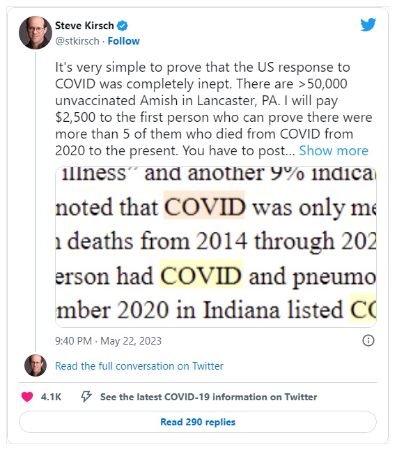 Da bi poentirao, Stiv Kirš nudi 2.500 dolara prvoj osobi koja može da pronađe više od šačice nevakcinisanih Amiša koji su umrli od COVID-a u Lankasteru, Pensilvanija tokom cele pandemije.