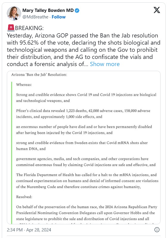 U ime očuvanja ljudske rase, izaslanici predsjedničke konvencije Republikanske stranke u Arizoni 2024. pozivaju guvernerku Hobbs i državno zakonodavstvo da zabrane prodaju i distribuciju Covid injekcija i svih mRNA injekcija u Arizoni, a državnog tužitelja Arizone da odmah zaplijeniti sve Covid injekcije i injekcije mRNA u Arizoni i izvršiti forenzičku analizu ovih takozvanih “cjepiva”.