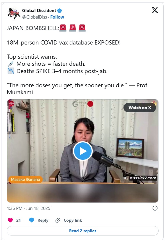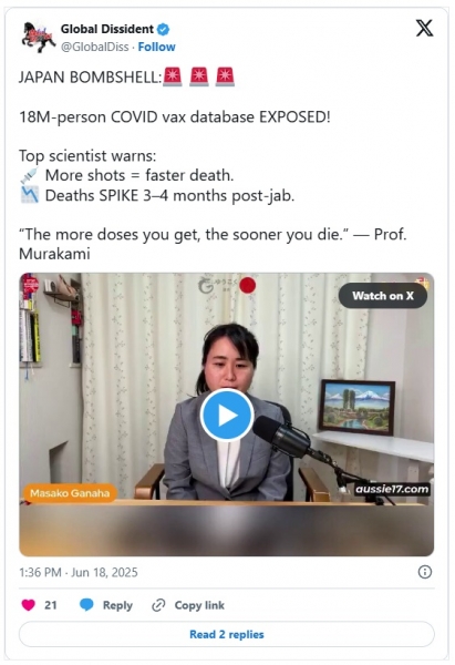 Dana 15. juna, grupa japanskih istraživača i aktivista objavila je eksplozivnu emisiju u kojoj su izneli podatke koje vlasti nisu htele da pokažu javnosti. Masako Ganaha, novinarka i istaknuti kritičar kovid politika, objavila je na mreži X: