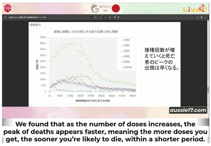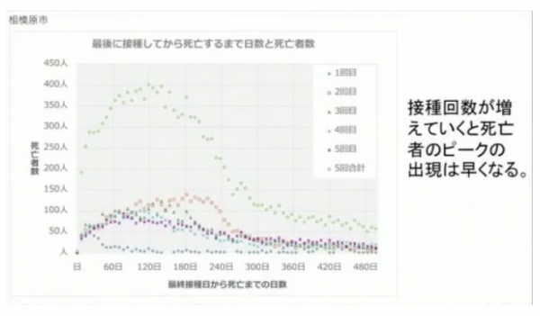 „Što je više doza primljeno, to se pik smrti javlja ranije.“ Svaka linija prikazuje grupe ljudi prema tome koliko su doza primili pre nego što su umrli. Na primer, „kriva za treću dozu“ prikazuje one koji su umrli nakon treće doze, a pre nego što su mogli primiti četvrtu.