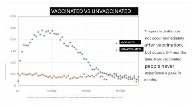 Kod nevakcinisanih, nema primetnog skoka u smrtnosti. Kod vakcinisanih, javlja se jasan pik smrtnosti između 90. i 120. dana nakon vakcinacije. „Značajan vrh se formira posle tri do četiri meseca. To je najverovatnije posledica vakcine – negativne reakcije koje dovode do smrti.“ Drugi grafikon: broj doza vs. brzina smrti