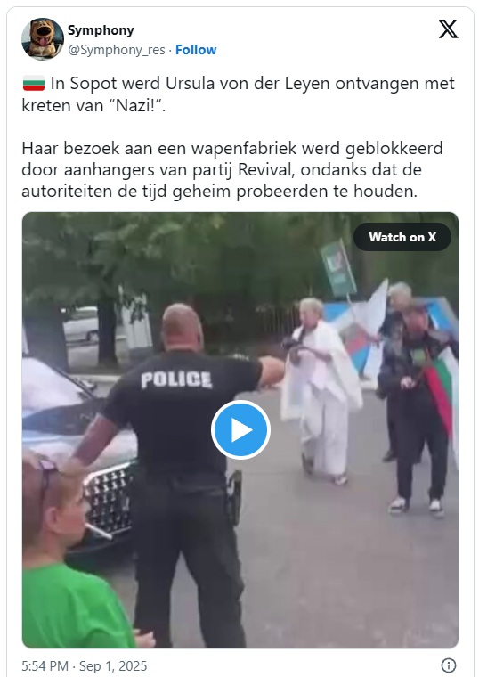 Predsjednica Europske komisije Ursula von der Leyen kratko je ismijana, a njezin automobil blokiran tijekom posjeta tvornici oružja u Bugarskoj u nedjelju.