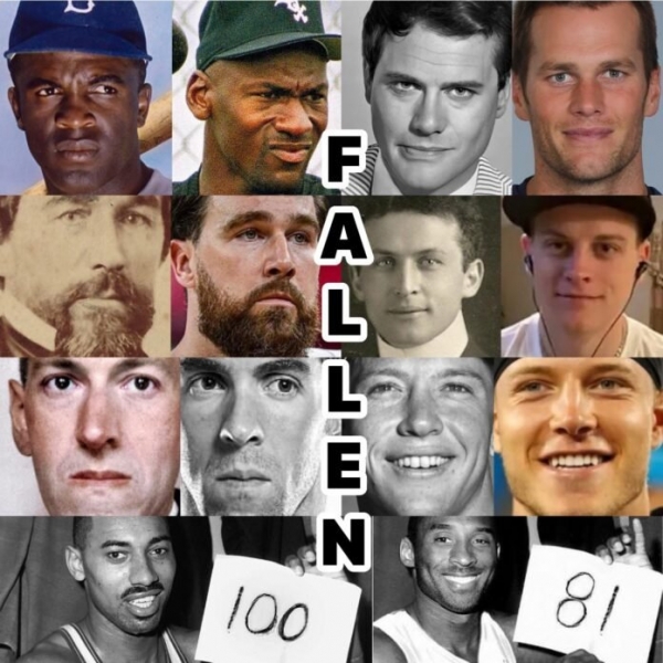 Tom Brady (igrač američkog nogometa) = Larry Hagman (glumac i zvijezda “I Dream of Jeannie”) – isti “butt chin”, usne, nos i bore na čelu; Peyton Manning (igrač američkog nogometa) = Gerald Ford (bivši predsjednik) – identični ožiljci, bore na čelu, madeži i “Omaha” kod kao referenca na Fordovo rodno mjesto; Kobe Bryant (košarkaš) = Wilt Chamberlain (u prošlosti košarkaš) → Myles Garrett (danas igrač američkog nogometa) – isti entitet u različitim epohama; Christian McCaffrey (igrač američkog nogometa) = Mickey Mantle (bejzbol legenda) – rođen odmah nakon Mantleove “smrti”; Michael Phelps (plivač) = H.P. Lovecraft (pisac) – “voli vodu”, medalje s padajućim anđelima; Kelly Slater (surfer) = RFK Jr. (američki ministar zdravstva) = Mel Gibson (glumac) – isti ožiljci na trbuhu (u obliku gljive), tetovaže (zmija, piramida, petokraka), identične usne/oči i ženine face-splice usporedbe; Travis Kelce (igrač američkog nogometa) = dio šire “National Fallen League” s Bradyjem i drugima; Michael Jordan (košarkaš) = Jackie Robinson (bejzbol legenda); Joe Burrow (igrač američkog nogometa) = Joe Namath (igrač američkog nogometa) = John Travolta (glumac) – dio istog “quarterback/entitet” lanca; Tony Hawk (skejter) = Bill Gates;