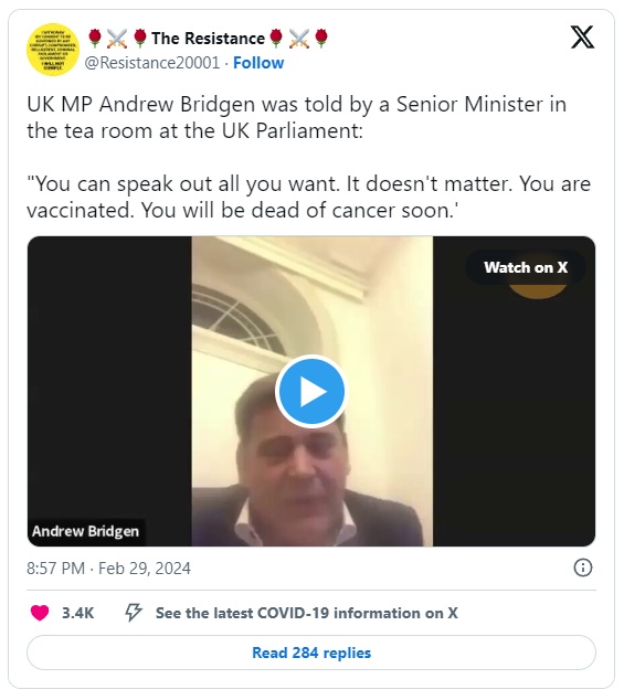 Cijepljeni ljudi uskoro će početi umirati u stotinama milijuna prema britanskom zastupniku Andrewu Bridgenu koji je otkrio da mu je viši ministar ispričao detalje plana korištenja turbo raka za depopulaciju stanovništva.