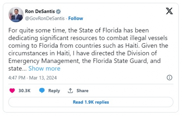 “S obzirom na okolnosti na Haitiju, naredio sam Odjelu za upravljanje u izvanrednim situacijama, Državnoj straži Floride i državnim agencijama za provođenje zakona da rasporede više od 250 dodatnih časnika i vojnika i više od desetak zračnih i pomorskih plovila na južnu obalu Floride kako bi zaštititi našu državu,” izjavio je DeSantis na X.