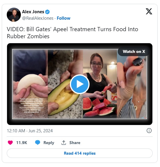 Alex Jones istražuje tvrdnje potrošača da se određeni proizvodi u velikim supermarketima pretvaraju u gumene Frankenfruitse nakon što su tretirani zaštitnim premazom na biljnoj bazi koji je financirao Bill Gates.