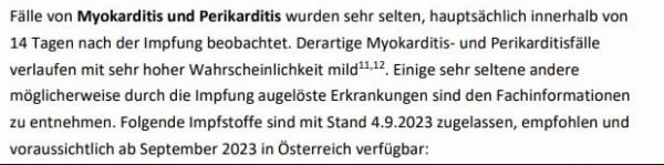 Uobičajeno spominjanje miokarditisa kao nuspojave očito više nije postojalo. Do sada se širio mit o “blagom” miokarditisu – koji zapravo dovodi do pretjerane smrtnosti među oboljelima. ( “Blagi miokarditis” nakon cijepljenja: svaki peti postaje pacijent na intenzivnoj njezi, od čega svaki četvrti umire ). Napomena u nastavku je uklonjena iz rasporeda cijepljenja.