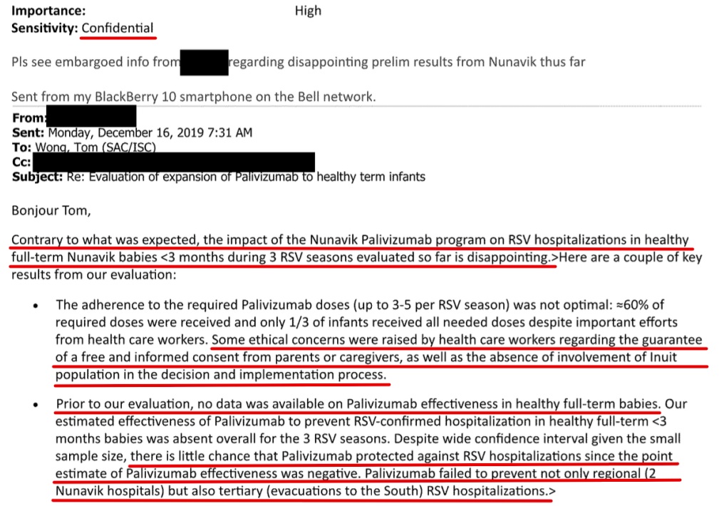 Ipak, umesto da zaustavi program, vlada je nastavila dalje. Roditelji su držani u mraku, kao i vođe Inuita i šira zajednica. Što je još gore, eksperiment je već propao – injekcije vakcine* protiv RSV Palivizumaba nisu funkcionisale kako je planirano.