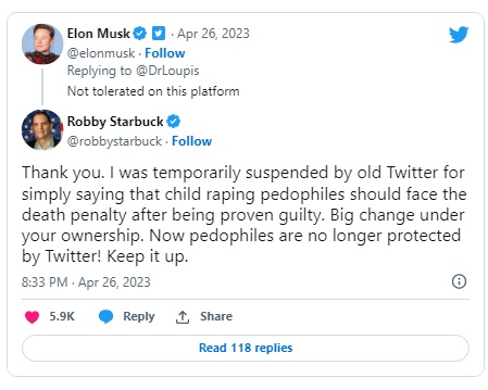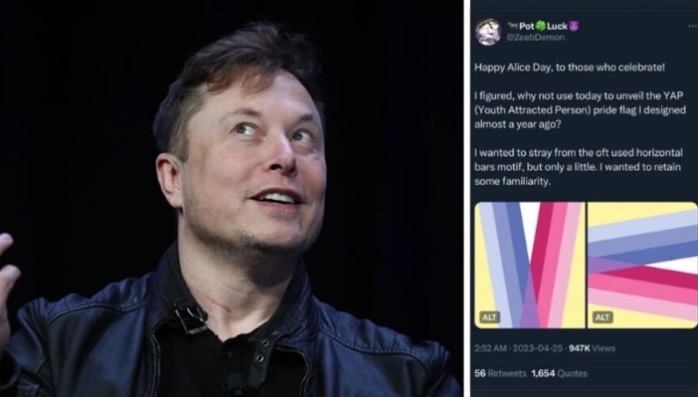 Twitter owner Elon Musk suspended the account of a person who proudly posted a picture of a "pride flag" (YAP - Youth Attracted Person), commenting that such content "is not tolerated on this platform". The individual posted a pedophilia flag and commented that it was made for "Alice's Day", April 25, which is essentially a "day of pride" recognized by pedophiles.