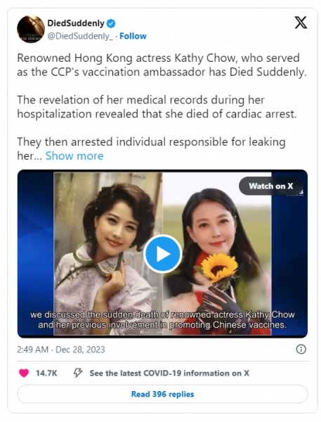 Renowned Hong Kong actress Kathy Chow, who served as the CCP's vaccination ambassador has Died Suddenly
