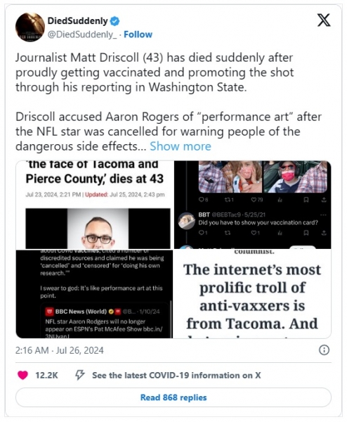 Journalist Matt Driscoll (43) has died suddenly after proudly getting vaccinated and promoting the shot through his reporting in Washington State ...