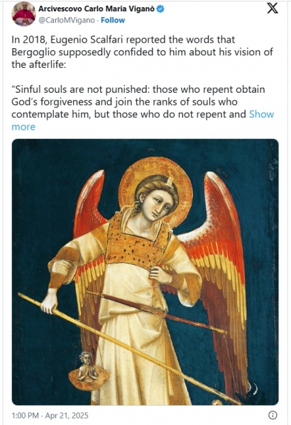 These heretical ravings are directly opposed to the Catholic Faith, which teaches us that there is a particular Judgment for everyone, which Bergoglio could not escape. His soul has therefore not disappeared, nor has it dissolved: he will have to account for the crimes he has committed, first of all having usurped the throne of Peter in order to destroy the Catholic Church and loose so many souls.